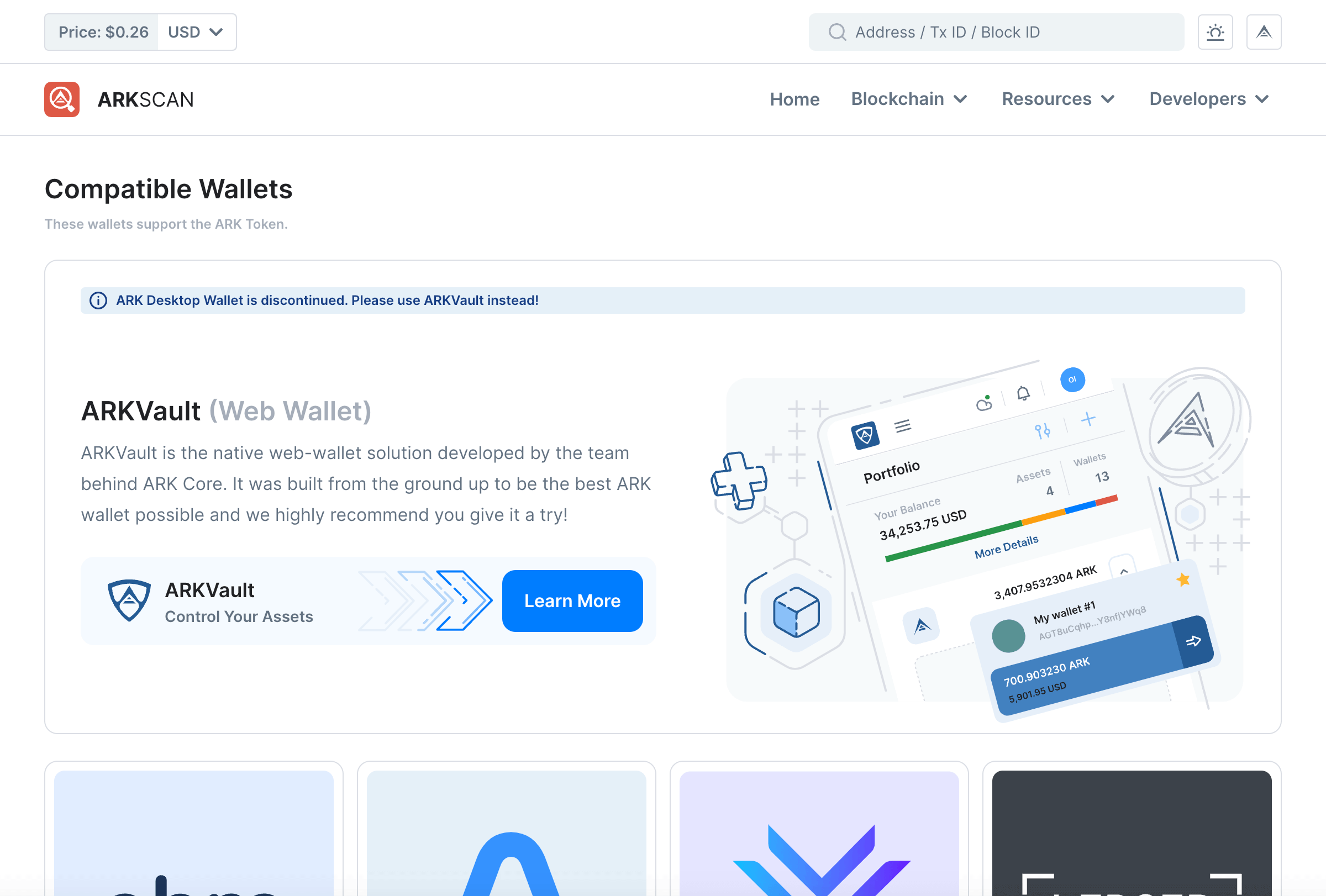 The Compatible Wallets page contains information regarding and links to wallets that support the ARK token. While ARKVault is the official web wallet built by the same team behind ARK Core, other wallets that support the ARK token include: