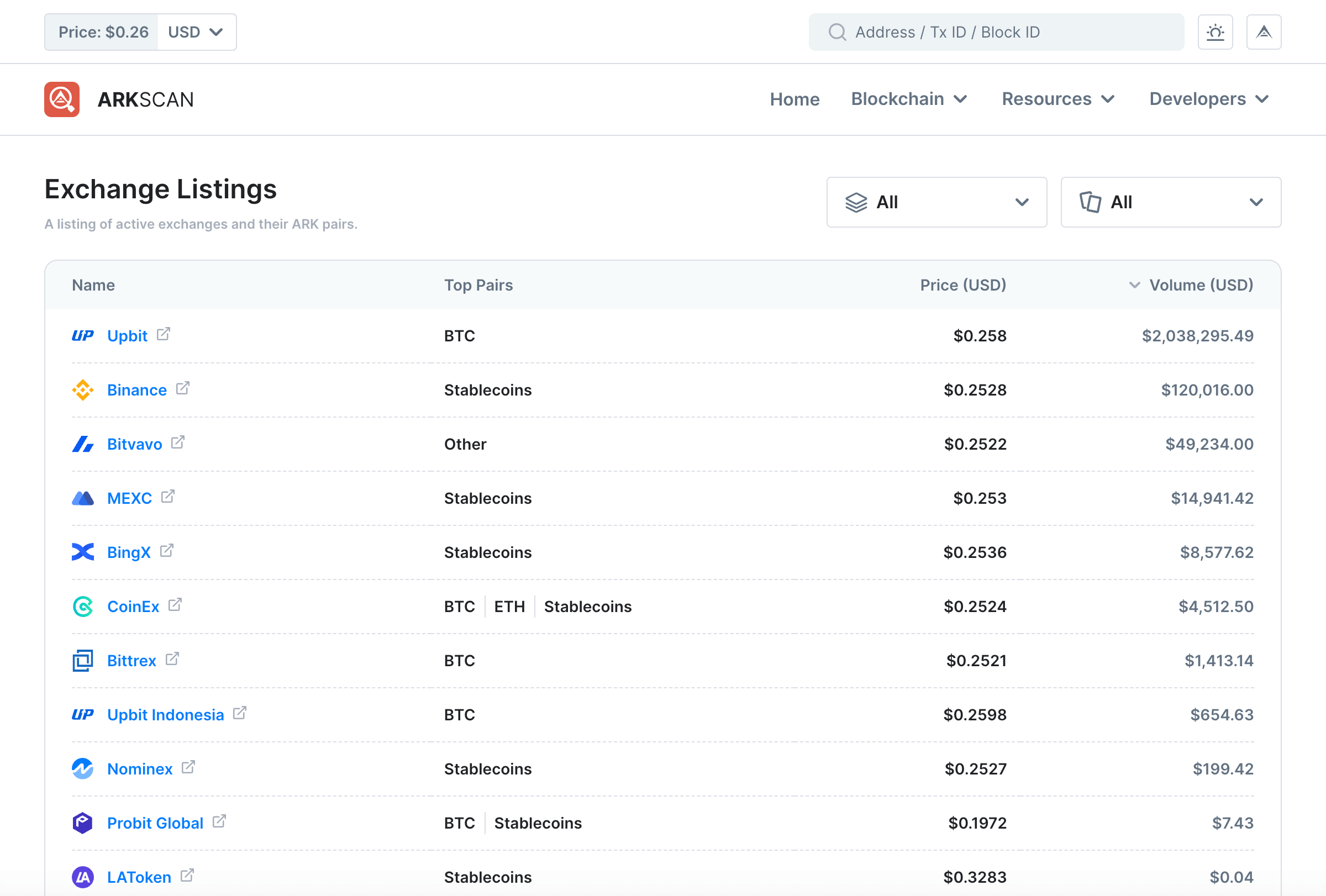 The Exchanges page lists all active exchanges as well as their corresponding ARK pairs. You will notice that both exchanges and aggregators appear together along with all types of ARK pairs. However, by clicking the first dropdown menu that appears in the upper right portion of the page, you may choose to view either Exchanges or Aggregators in isolation. Similarly, by clicking on the second dropdown menu, you may choose to view exchanges and/or aggregators according to BTC, ETH, Stablecoins or Other ARK pairs.