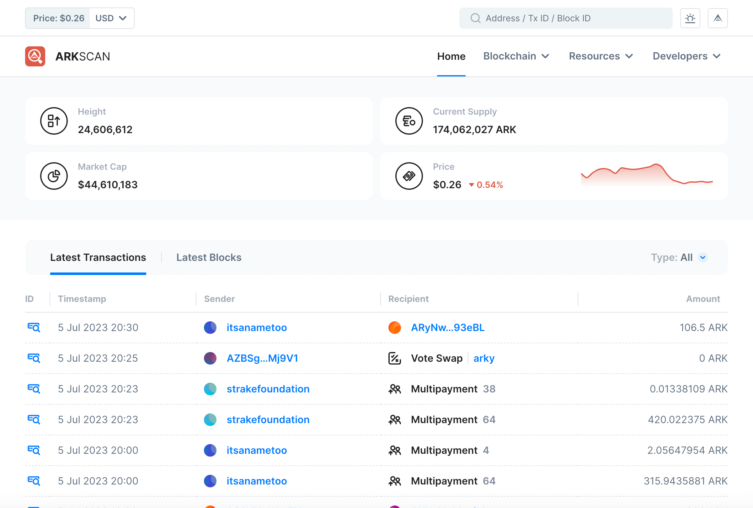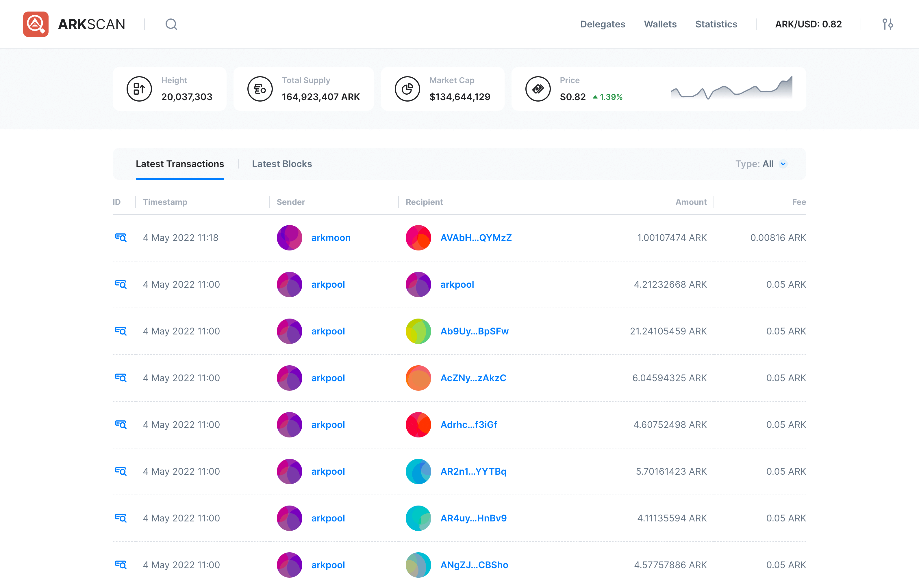 The most recent transactions appear beneath this section and effectively offer a snapshot of the latest activity on the ARK Blockchain.