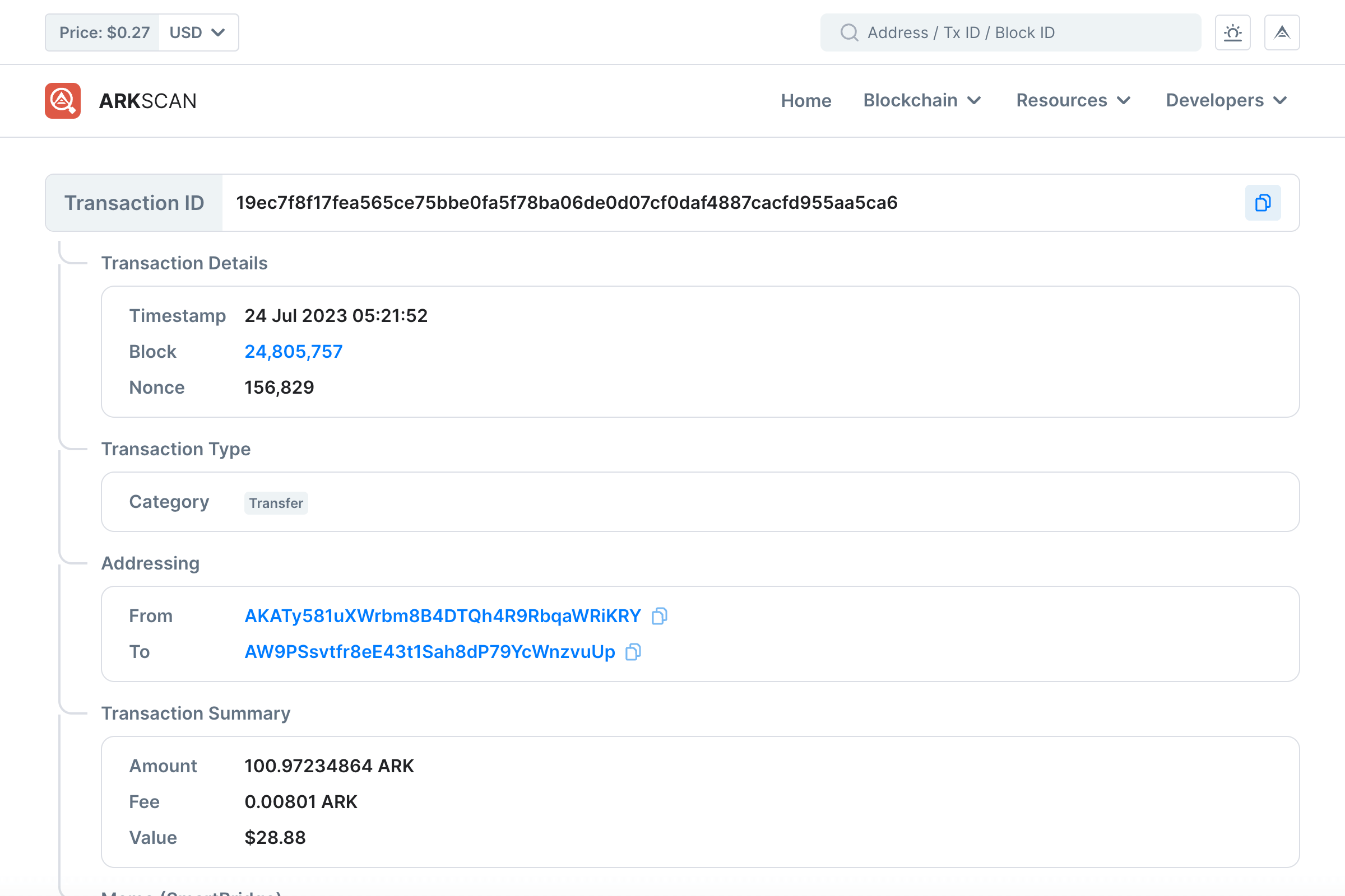- Transaction Summary - Indicates the total number of ARK coins transferred as well as the transaction fee (denominated in ARK) as well as the value of the transaction in fiat currency