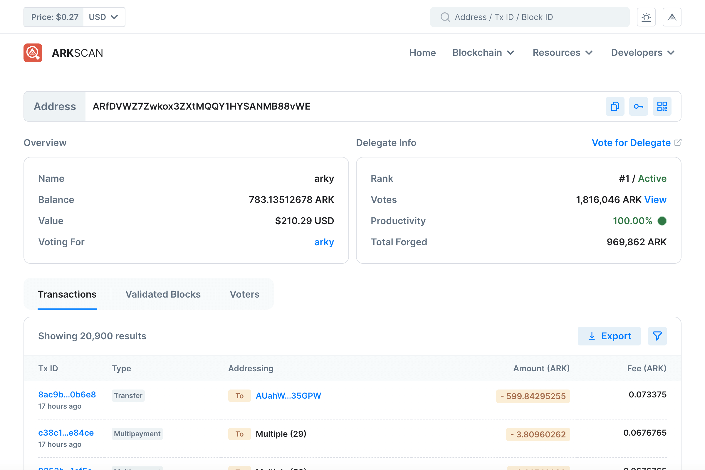 ARKScan features several improvements that make it far easier to navigate and locate important information. Its intuitive UI greatly enhances the overall experience for end users and makes ARKScan a useful tool for anyone looking to locate important information related to transactions, wallets, Delegates and more. The following sections outline all of ARKScan’s features as well as the various page types and layouts a user can expect to find. You will also find some helpful tips interspersed throughout this page to make your ARKScan experience that much more enjoyable.